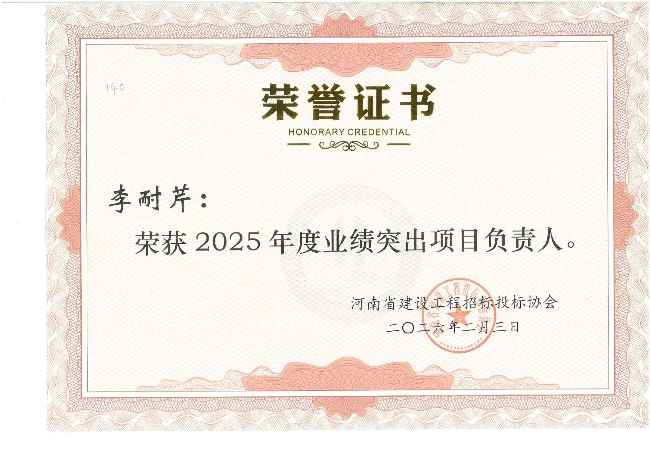 與此同時(shí),公司員工李耐芹同志在2025年度項(xiàng)目管理工作中表現(xiàn)突出,憑借扎實(shí)的專(zhuān)業(yè)能力、嚴(yán)謹(jǐn)?shù)墓ぷ髯黠L(fēng)和優(yōu)異的工作業(yè)績(jī),從眾多參評(píng)人員中脫穎而出,榮獲“業(yè)績(jī)突出項(xiàng)目負(fù)責(zé)人”稱(chēng)號(hào)。這一榮譽(yù)不僅是對(duì)李耐芹同志個(gè)人能力的充分肯定,也展現(xiàn)了河南精工工程管理咨詢(xún)有限公司在人才培養(yǎng)和團(tuán)隊(duì)建設(shè)方面的顯著成效。