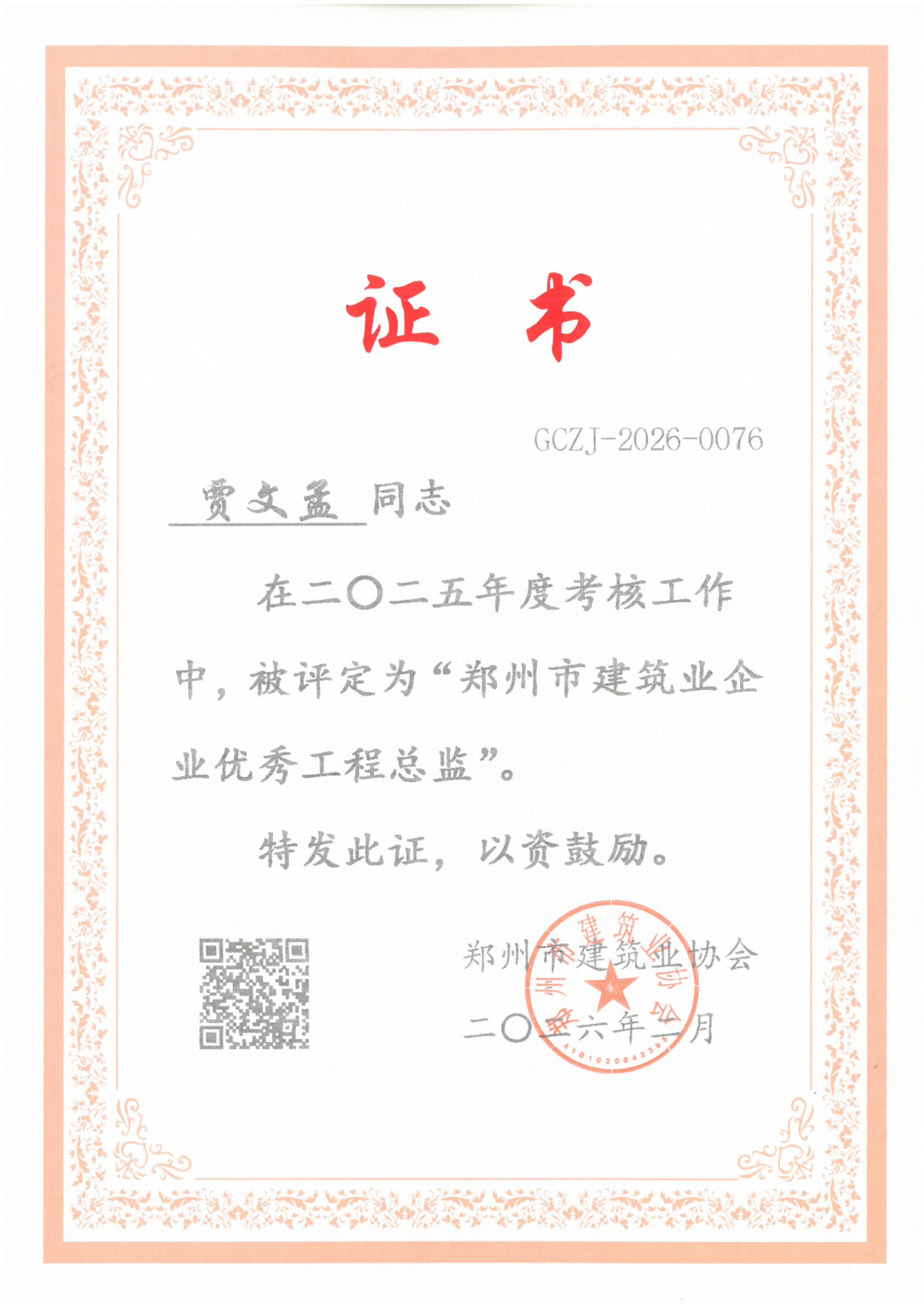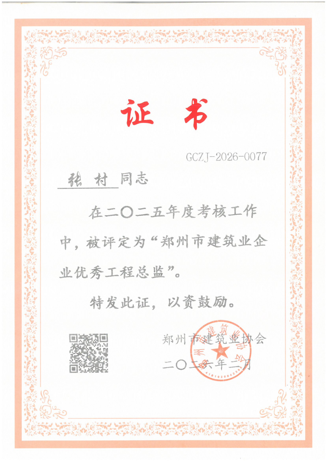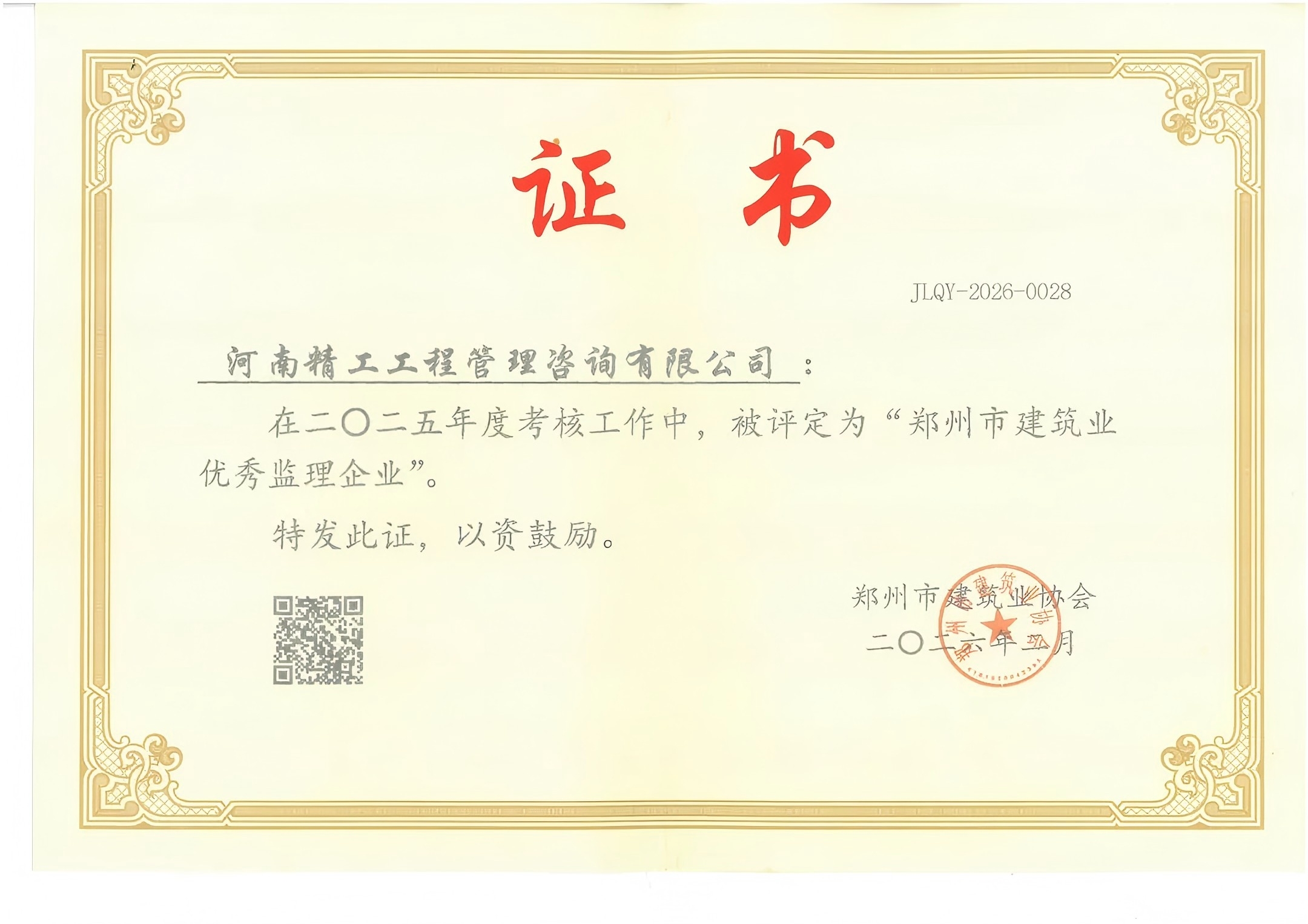 近日,鄭州市建筑業(yè)協(xié)會(huì)公布了二〇二五年度考核工作評(píng)選結(jié)果,精工咨詢憑借卓越的綜合實(shí)力和良好的行業(yè)口碑,榮獲“鄭州市建筑業(yè)優(yōu)秀監(jiān)理企業(yè)”稱號(hào)。同時(shí),公司賈文孟、李世澤、薛洋、張曉磊、張村五位同志被評(píng)定為“鄭州市建筑業(yè)企業(yè)優(yōu)秀工程總監(jiān)”。