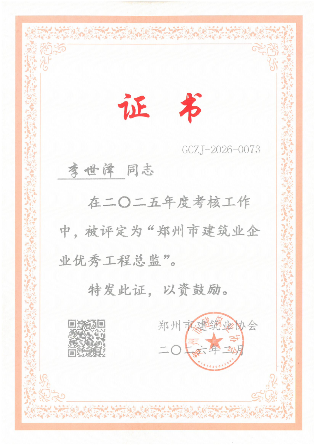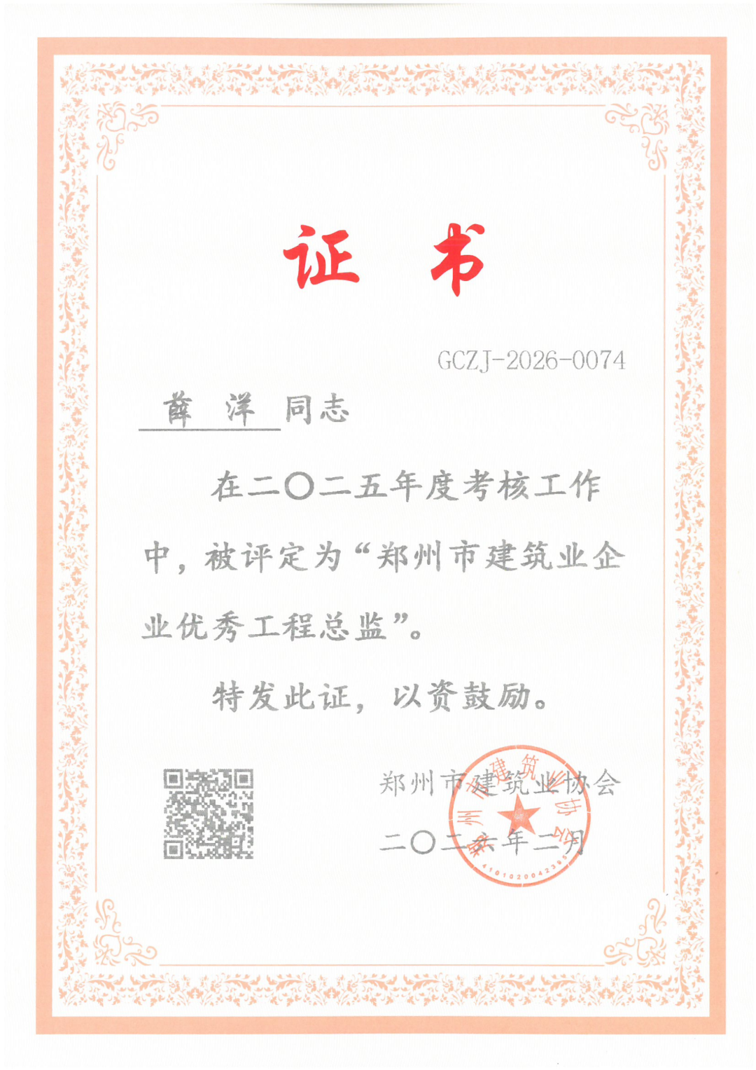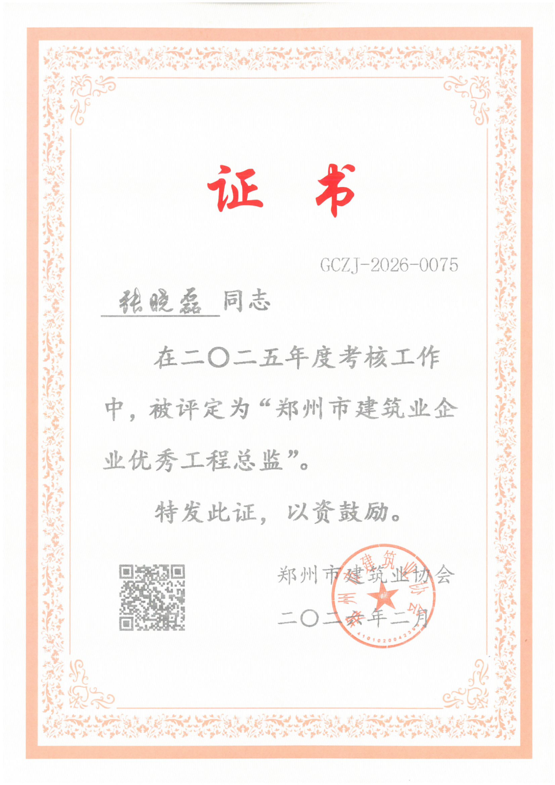 近日,鄭州市建筑業(yè)協(xié)會(huì)公布了二〇二五年度考核工作評(píng)選結(jié)果,精工咨詢憑借卓越的綜合實(shí)力和良好的行業(yè)口碑,榮獲“鄭州市建筑業(yè)優(yōu)秀監(jiān)理企業(yè)”稱號(hào)。同時(shí),公司賈文孟、李世澤、薛洋、張曉磊、張村五位同志被評(píng)定為“鄭州市建筑業(yè)企業(yè)優(yōu)秀工程總監(jiān)”。
